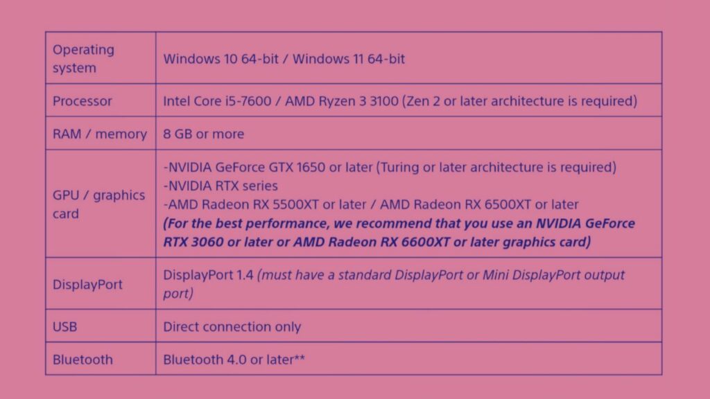 Sony states that this adapter will support all Steam VR games, including big titles like Half-Life: Alyx. However, to play these games on PC, a DisplayPort cable will be needed. Additionally, a Steam account will be required. You can check the minimum system requirements below.