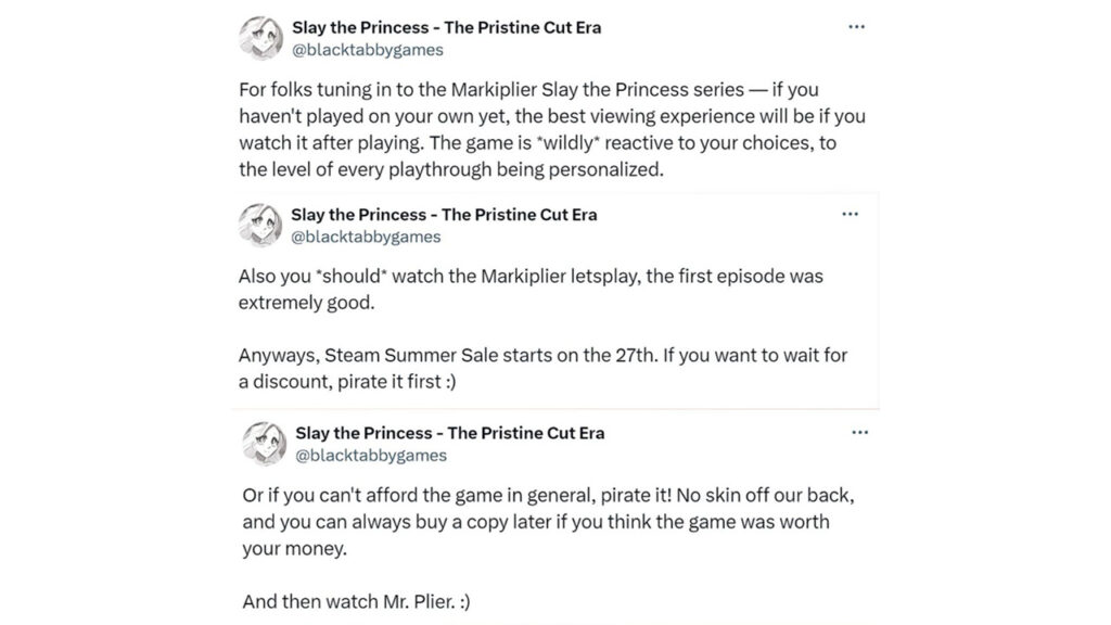 Black Tabby Games, the developer of Slay the Princess, has advised players to pirate the game before buying it. This decision comes after the game was played and popularized by YouTubers.